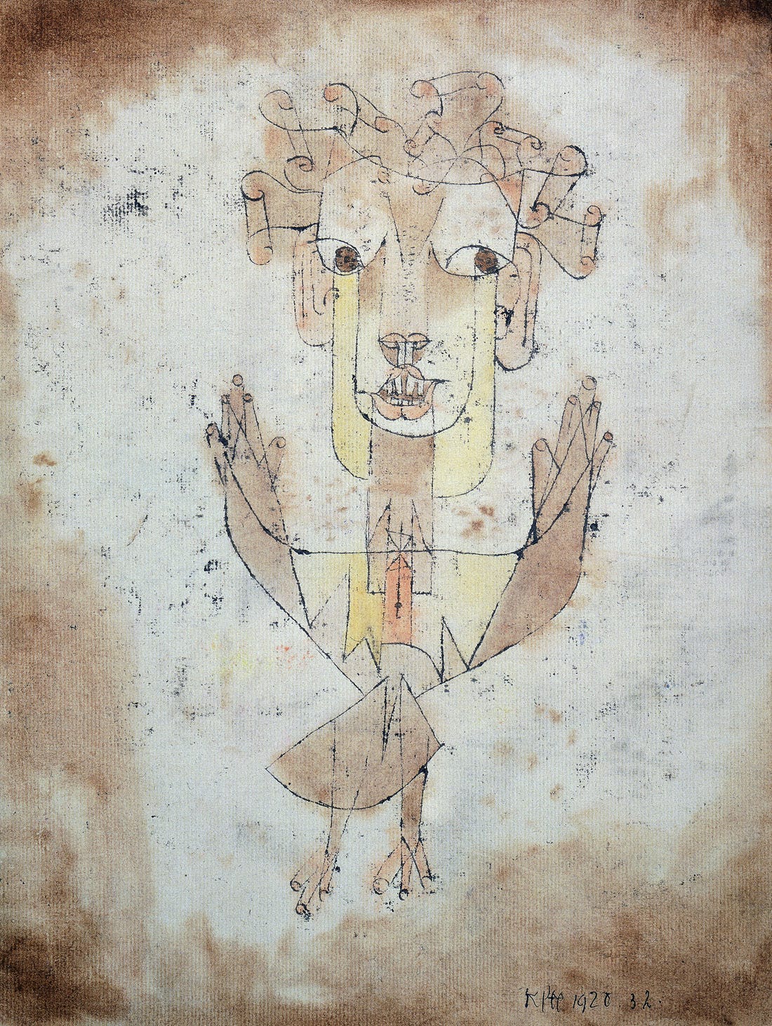 At this point in the essay it’s clear Benjamin’s not speaking of the Dutch woman as an angel, but of his “Angelus Novus,” the 1920 drawing by Paul Klee which became Benjamin’s prized possession when he bought it Munich in 1921 for a thousand Deutschmarks.